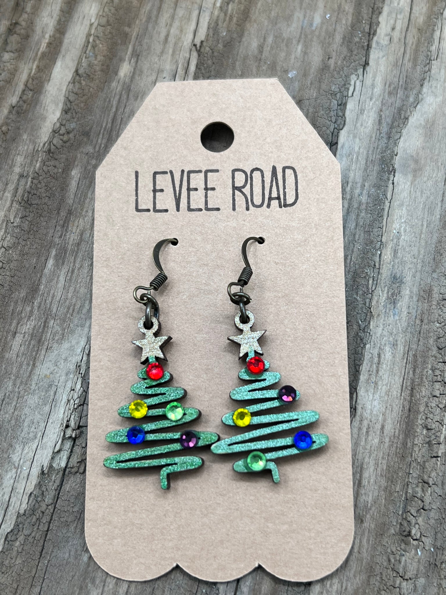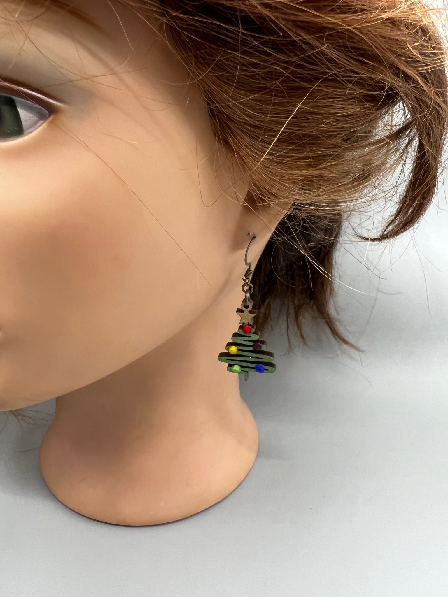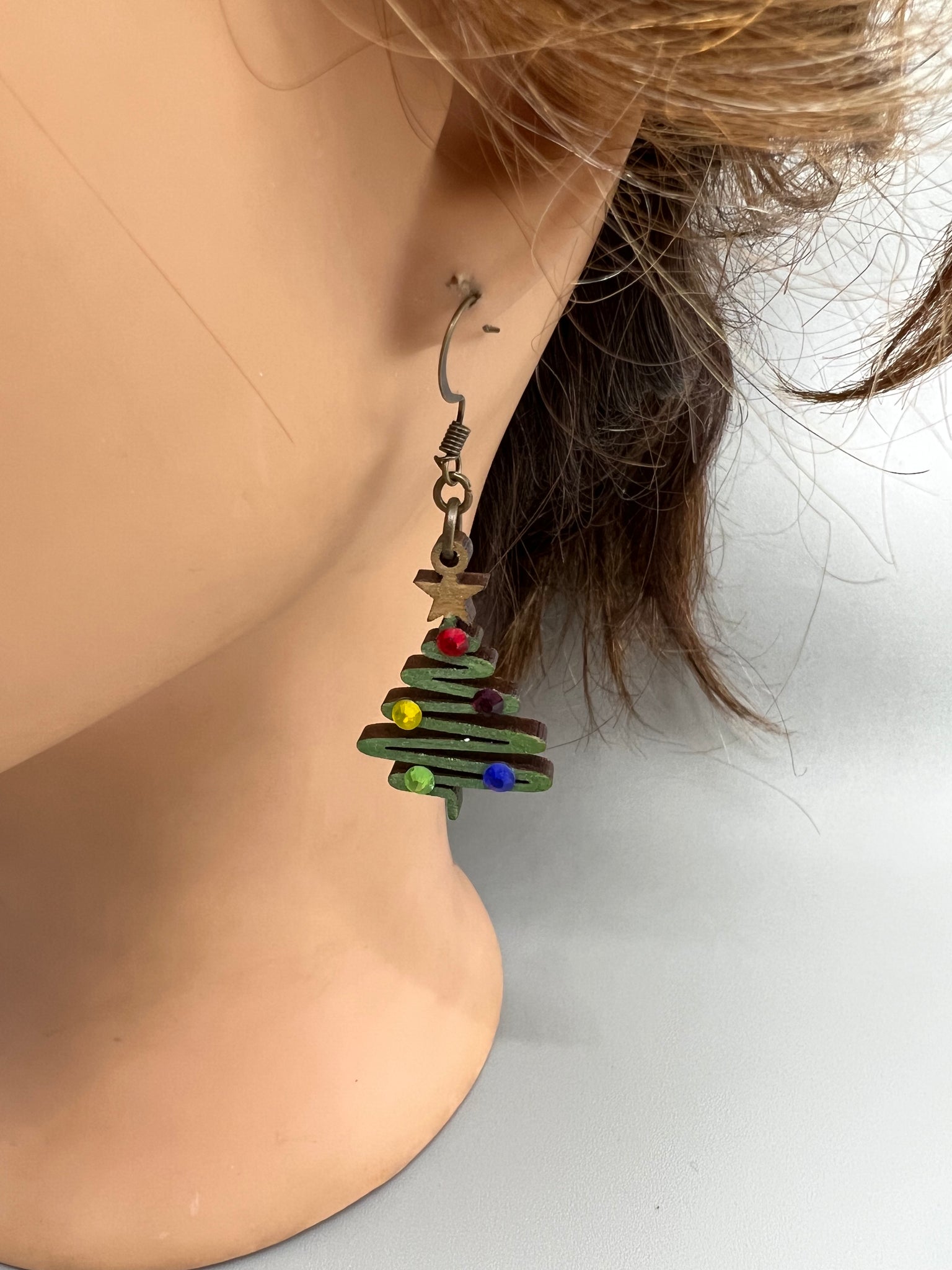 Cute little squiggle trees with lights to shine and celebrate the season. Wood & lightweight. Perfect little Christmas earring 1.5 inch